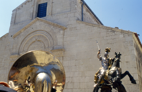 Allora il re e la popolazione si convertirono e il prode cavaliere uccise il drago facendolo portare fuori dalla città, trascinato da quattro paia di buoi. La leggenda era sorta al tempo delle Crociate, influenzata da una falsa interpretazione di un’immagine dell’imperatore cristiano Costantino, trovata a Costantinopoli, dove il sovrano schiacciava col piede un drago, simbolo del “nemico del genere umano”.