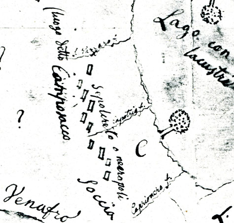 Il letto e corso del Volturno, che sorse dalla irruzione del lago di Rocchetta, non è qui segnato. Il Volturno col suo ruinoso allagamento segnò la cessazione dell’età della Pietra e del Bronzo dopo l’epoca glaciale. Allora i popoli, estinta la gigantesca fauna, fuggirono sulle cime de’ monti per difendersi e agguerrirsi contro le colonie Fenici e Greche.