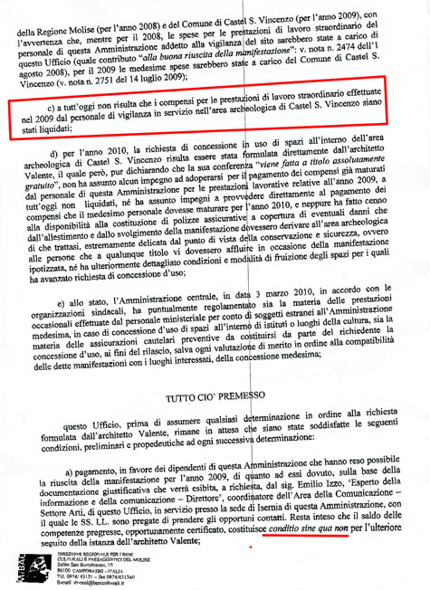 Se voglio discutere della richiesta di autorizzazione (senza la certezza di un esito positivo), io devo prima eliminare tutti i debiti che (secondo lui) l’amministrazione comunale di Castel S. Vincenzo avrebbe contratto nel passato con la Direzione Regionale per i Beni Culturali del Molise.