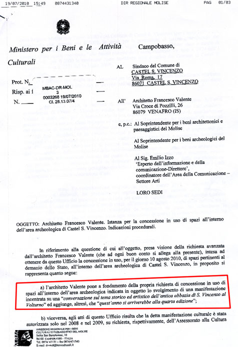 Poi ho scoperto che veramente esiste perché questa mattina ha risposto alla mia richiesta di autorizzazione a tenere la tradizionale conferenza del 10 agosto nell’area archeologica di S. Vincenzo al Volturno.