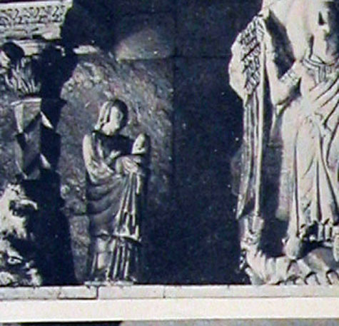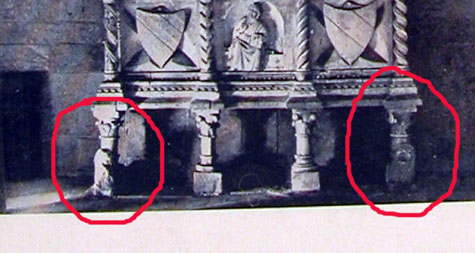 All’epoca delle foto (anni Trenta del secolo scorso) era già scomparsa un’altra figura posta sulla parte di destra. Di essa ora rimane il basamento lapideo che non presenta alcuna traccia che possa far capire quale fosse il soggetto rappresentato.