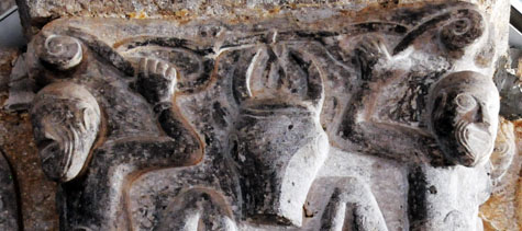 Vi si vedono due strani personaggi che, in posizione rannicchiata, si mantengono appesi alle quattro piccole volute che, a due a due, sono sottoposte agli spigoli dell’abaco. Volute piuttosto particolari perché il listello curvilineo non prosegue innestandosi secondo il solito in una figurazione a foglie di acanto, ma rigira su se stesso a formare un occhiello al quale è legata una corda che si unisce all’altro occhiello dell’altra voluta.