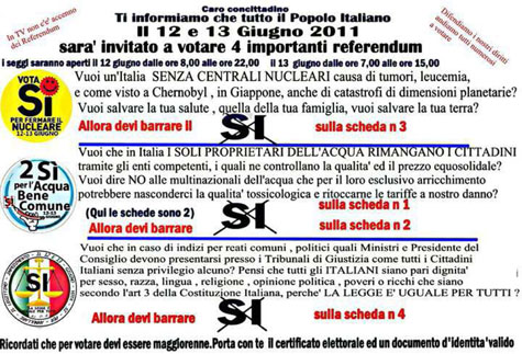 se a questi referendum non toglieranno il ” quorum” in Italia poche cose cambieranno. Purtroppo la cricca politica ha tutto l’interesse a mantenere lo “status quo” e il popolo italiano, o gran parte di esso, continuerà a farsi beatamente ingannare.