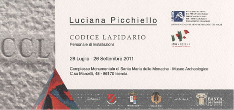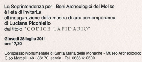 Luciana Picchiello, dalle ore 17,30 di giovedì 28 luglio 2011, espone il suo CODICE LAPIDARIO nell’antico monastero longobardo di S. Maria delle Monache di Isernia, ora Museo Archeologico.