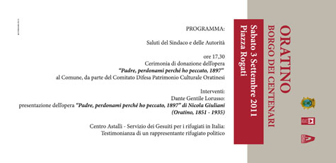 Oggi 3 settembre 2011 ad Oratino un’opera di Nicola Giuliani (Padre, perdonami perché ho peccato) del 1897 viene donata al Comune su iniziativa del Comitato a Difesa del Patrimonio Culturale Oratinese.