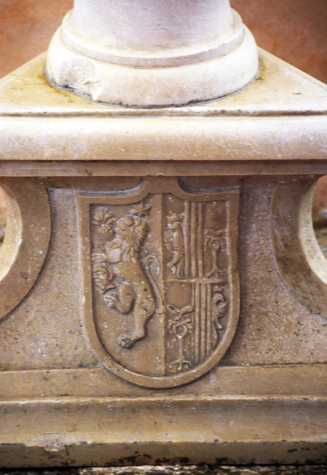 Lo stemma di Carlo è posto sia al disopra che sul lato sinistro della lapide ed è partito con quello di sua moglie Cecilia Pepi, costituito da un palo di argento su campo rosso.