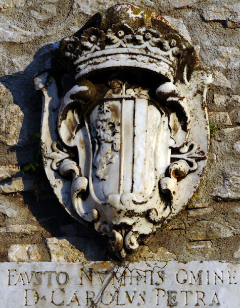 L’unione tra Vincenzo e Settimia è ricordato in 2 stemmi, uno dei quali, con la data 1626, è posto sulla porta principale del nucleo abitato. Al blasone dei Petra, infatti, è unito quello dei Filonardi che è costituito da uno scudo inquartato. Nel 1° e nel 4° partito d’oro all’aquila imperiale uscente dalla partizione, e d’azzurro a due pali d’oro; nel 2° e 3° di rosso alla quercia sradicata d’oro con i rami passati in doppia croce di Sant’Andrea.