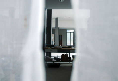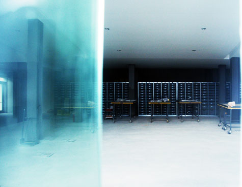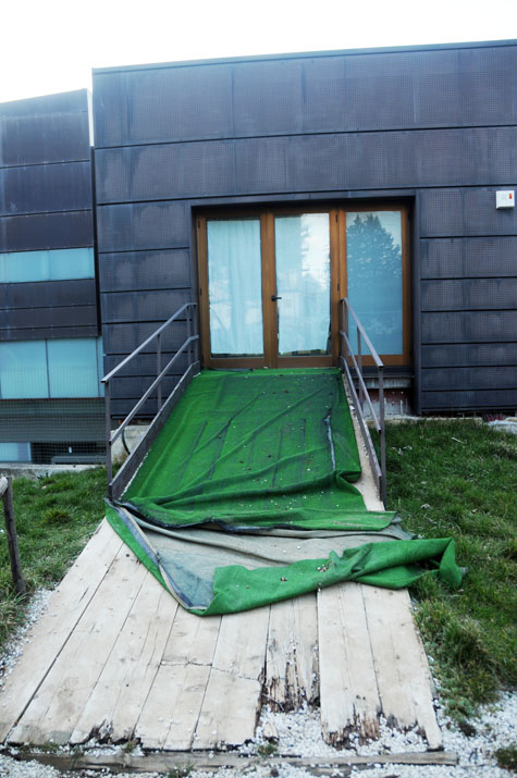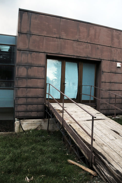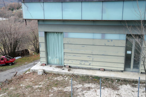 Questo si riesce a sbirciare dalle vetrate. Schedari abbandonati, attrezzature ammucchiate, sporcizia e disordine dappertutto, pavimenti non finiti, ragnatele in ogni angolo!