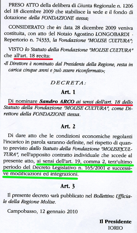 Il Decreto del Presidente Iorio con il quale si nomina il sig. Sandro Arco a Direttore Generale della Fondazione Molise Cultura, nonostante non abbia la laurea prevista dal CCNL sottoscritto anche dalla Regione Molise, dice due cose importanti:
