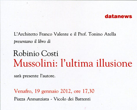 Verrà presentato giovedì prossimo, 19 gennaio, alle ore 17,30, nella Sala Conferenze dell’Associazione Culturale “IL GRUPPO DI VENAFRO”, in Vico dei Battenti (Piazza Annunziata-Vico della Vergine), il libro di Robinio Costi “Mussolini. L’ultima illusione”.