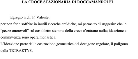 Sulla Croce stazionaria di Roccamandolfi è ripetuto quattro volte un misterioso stemma. Misterioso perché è di un committente al quale non si è in grado di risalire con certezza.