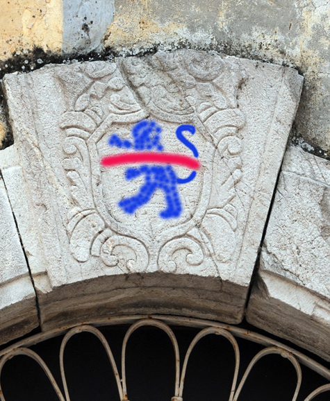 Lo stemma è stato cancellato, una damnatio-memoriae, ma qualche debole segno lascia capire che una volta nello scudo vi fosse una fascia su un leone rampante.