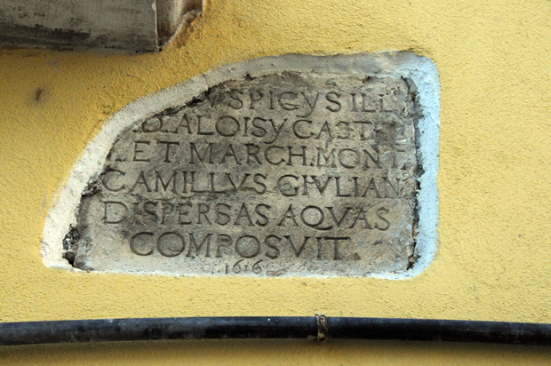 L’epigrafe si riferisce ai lavori di riordino di una serie di piccole sorgenti che, essendosi disperse, nel 1616 furono ricomposte e fatte confluire in un unico canale per alimentare una fonte. Vi provvide Camillo Giuliano con gli auspici di Luigi Castelletti: