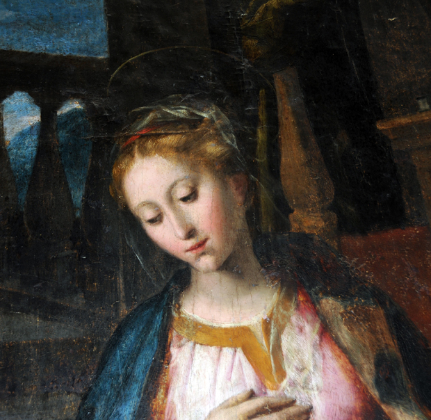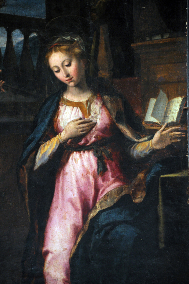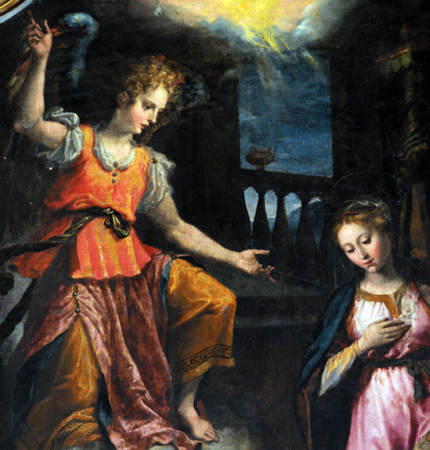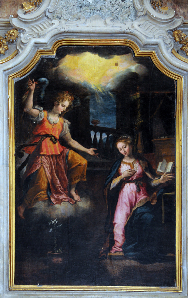 L’Angelo Gabriele è colto nel momento in cui sta per genuflettersi su una nuvola che lo tiene sollevato rispetto al piano su cui poggia Maria, sorpresa a leggere un libro di preghiere che è su un leggio alle sue spalle. Sullo sfondo una balaustra anticipa uno squarcio di luce che apre su un paesaggio agreste. In primo piano, sulla sinistra, un giglio fiorito in un vaso biansato richiama la purezza della Vergine, prossima Madre di Dio.