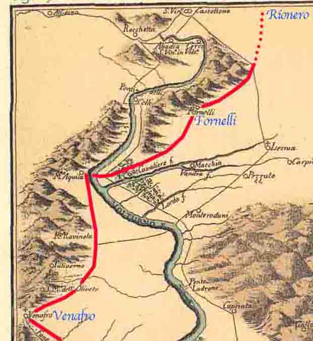 Avendo S. M. rinfrescato all’osteria dei Rotondi, elle è nel luogo dove si passa la scafa del Volturno, piovette tutta la giornata; per lo che il fiume Volturno era in mediocre piena. Dal re e da pochi altri si passò il menzionato fiume sopra la scafa. Ma da tutti gli altri del numeroso seguito si passò a guazzo; da alcuni in galesse, da altri a cavallo, e da alcuni anche a piedi: il che non fu senza pericolo, per l’impeto con cui le acque correvano. Bagnati e malconci, giugnemmo la sera ai Fornelli, dove, per l’angustia degli alloggi, quasi tutti stettero assai male; ed a me toccò di alloggiare in casa di un povero villano.