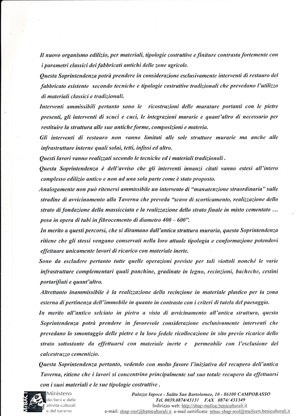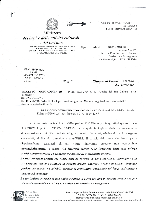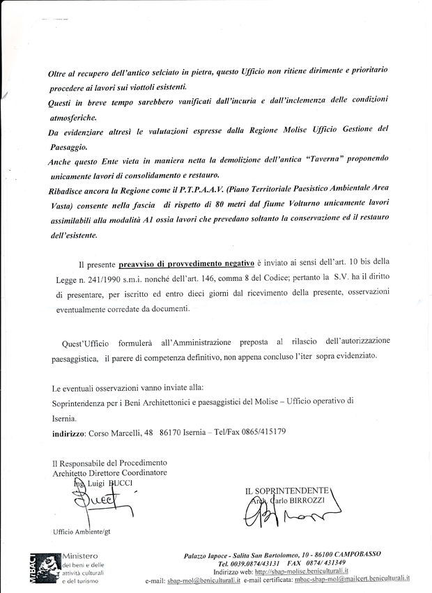 Fortunatamente il progetto è stato inviato alla Soprintendenza ai Beni Architettonici del Molise (arch. Birrozzi e ing. Luigi Bucci) e alla Commissione Beni ambientali della Regione Molise (arch. Francesco Manfredi Selvaggi) che lo hanno bocciato con motivazioni che io avrei accompagnato con un deferimento all’Ordine degli Architetti per la gravità di una simile proposta progettuale.