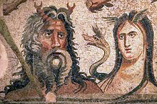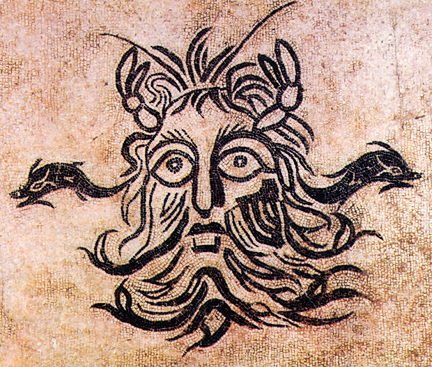 Oceano, nel grande bassorilievo di Sepino, secondo il solito ha l’aspetto di un anziano gigante barbuto dai grandi occhi.