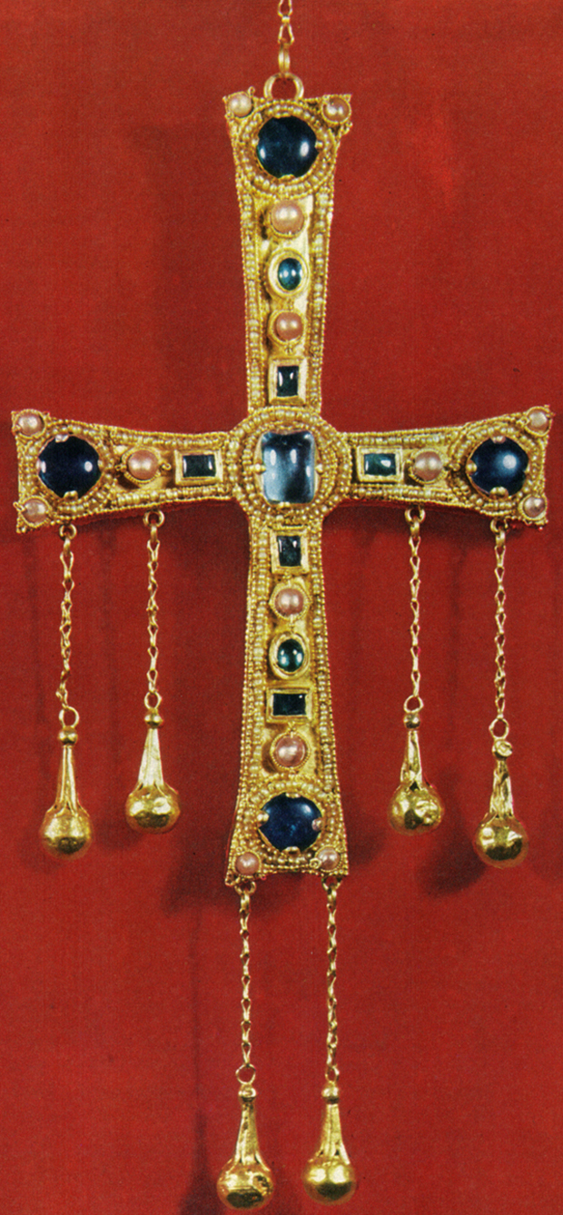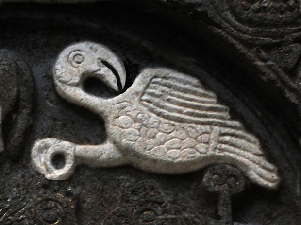 Si rivolge all’indietro con il capo a guardare verso l’alto, al disopra della croce dalla forma molto particolare per avere i bracci che si allargano verso l’esterno. E’ la croix pattée che, di origine bizantina e longobarda, poi fu utilizzata dai Cavalieri Teutonici e divenne in epoca normanna anche il simbolo dei Cavalieri Templari.Un tipo di croce che conosciamo già dall’epoca di Agilulfo (inizio VII secolo) che ne fece fare una gemmata nel momento in cui i Longobardi si avviavano a diventare definitivamente cristiani.