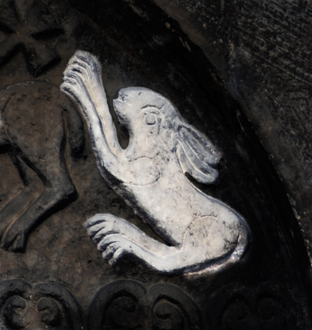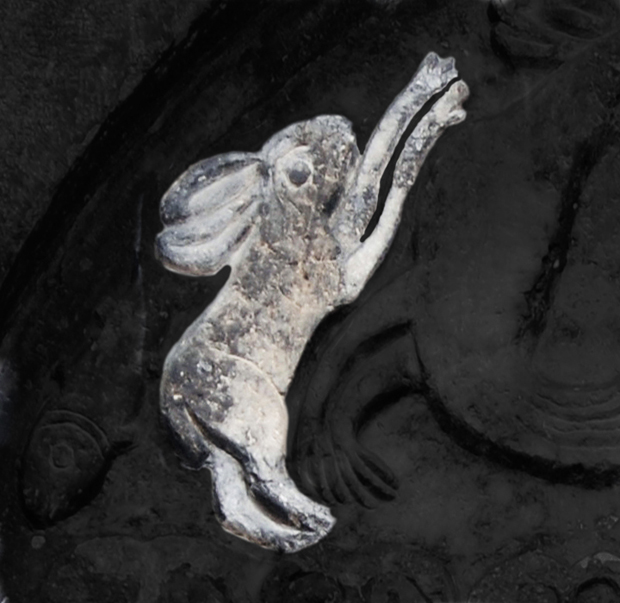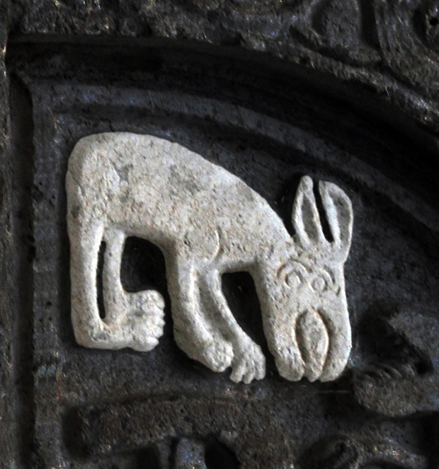 Sicuramente originale la presenza di due lepri che accennano alla corsa. S. Agostino paragona alla lepre il peccatore che, pentito, si confessa per ritornare a Dio. Nei battisteri la lepre è il simbolo dei catecumeni che si apprestano a ricevere il battesimo, ma per la sua capacità di cambiare il colore del mantello durante l’anno diviene, secondo S. Ambrogio, anche il simbolo della resurrezione.