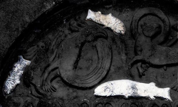 Infine tre pesci disposti complessivamente a formare un triangolo sono il simbolo della Trinità. Nel Molise, nell’acquasantiera di S. Maria delle Grazie di Riccia, in epoca molto più tarda (XVI secolo) vediamo i tre pesci serrarsi in maniera da creare una forma chiusa che impedisce ai serpenti, figure che evocano Satana, di entrare.