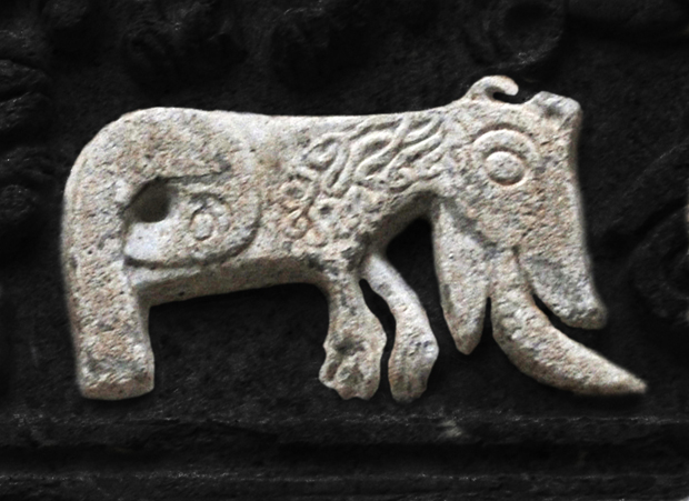 Egualmente nessun riferimento con il mondo animale si trova nell’esemplare in basso a destra con una singolare coda che si infila tra le zampe posteriori per innalzarsi verticalmente e terminare a forma di paletta su cui è scanalata una S speculare. Dalla bocca spalancata esce una specie di proboscide rigirata all’indietro.