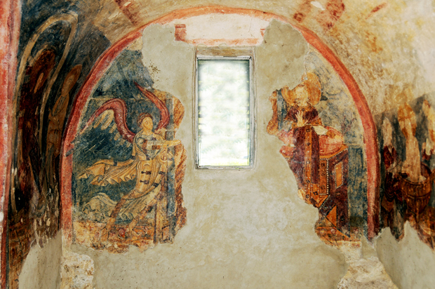 La piccola finestra anticamente permetteva di osservare dall’aula della sovrastante chiesa l’interno dell’ambiente inquadrando specificamente la parte centrale con la rappresentazione degli Arcangeli.