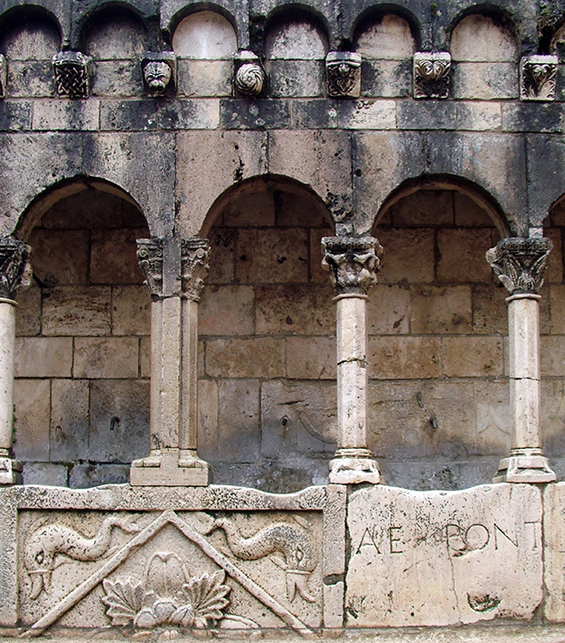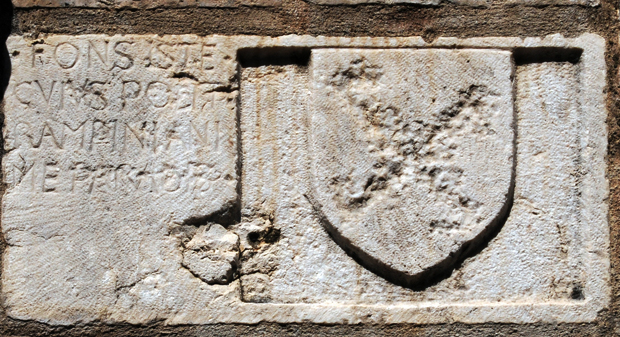 Detto solo di passo, ma l’intera targa pare essere stata “lavorata”, ossia scavata affinché vi fosse incastrato un insolito scudo araldico, asportandosi in questo modo il vero seguito e senso della frase compiuta: “- Fons iste – ….cuius Pontius… – … -, etc.”. Laddove il blasone di una data famiglia venuta secoli dopo, poco o nulla c’entra.