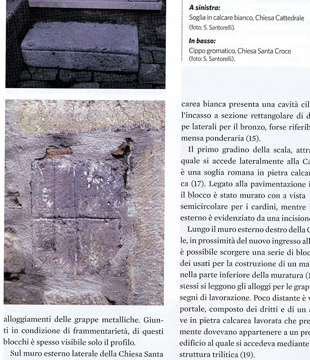 Stessa fine pare abbia subito un’altra pietra che nel passato è stata malamente ritenuta un cippo gromatico per il fatto di avere un disegno che sembrava essere la sintesi geometrica di una centuriazione cardo-decumanica.