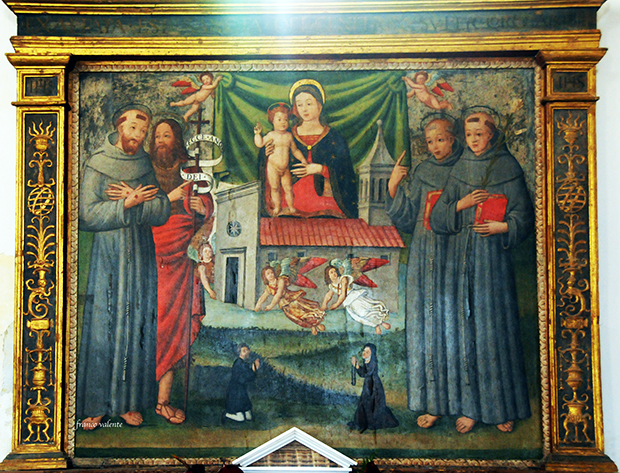 Il quadro principale contiene l’immagine della Madonna che tiene il Cristo bambino benedicente in piedi sulla Casa di Loreto. Due angeli reggono un telo verde alle spalle e altri tre angeli mantengono in volo la casa di Maria che viene rappresentata in una forma che potrebbe essere quella della chiesa del Convento prima delle trasformazioni riconducibili al XVII-XVIII secolo.