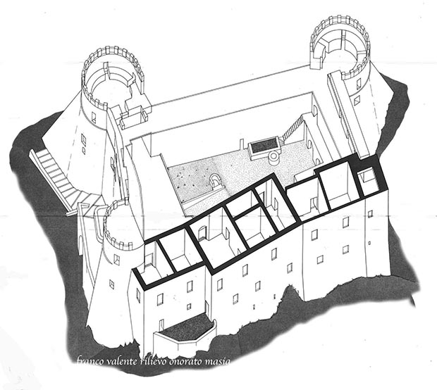 L’impianto originario è costituito da un recinto quadrangolare, atto ad ospitare prodotti raccolti dal territorio quale magazzino fortificato.