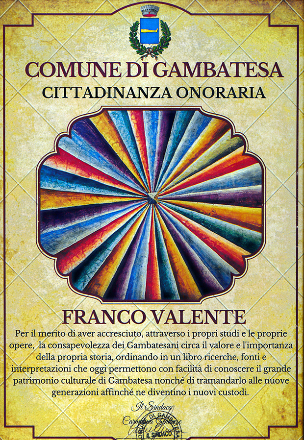 Avrai potuto notare, caro Franco, come il popolo di Gambatesa già da qualche tempo è consapevole di tutto ciò, accogliendoti ad ogni tua visita, come se fossi un emigrante che di tanto in tanto torna nella sua terra natia a ritrovare amici e parenti lontani. Tutti ti salutano e ti chiamano per nome, se ti fermi in un bar trovi tante persone pronte a prendere un caffè in tua compagnia e scambiare quattro chiacchiere con te come se foste legati da antica amicizia.