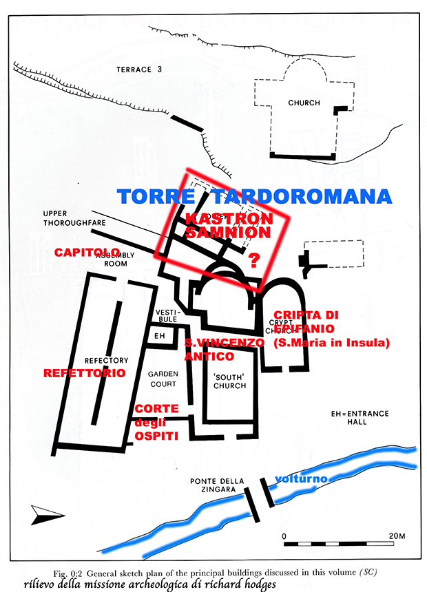 La presenza di una torre nell’ambito degli edifici attigui alla basilica di S. Vincenzo al Volturno, nell’area che dovrebbe corrispondere al primo edificio abbaziale, tra il primo S. Vincenzo antico e la chiesa di S. Maria in Insula con la cripta di Epifanio fa ritenere che questo luogo, che il Cronista vulturnense definisce locum ubi vocatur Samnia, sia stato occupato in forma stabile dai soldati di Belisario proprio subito dopo il passaggio di Pitzas con l’esercito bizantino.